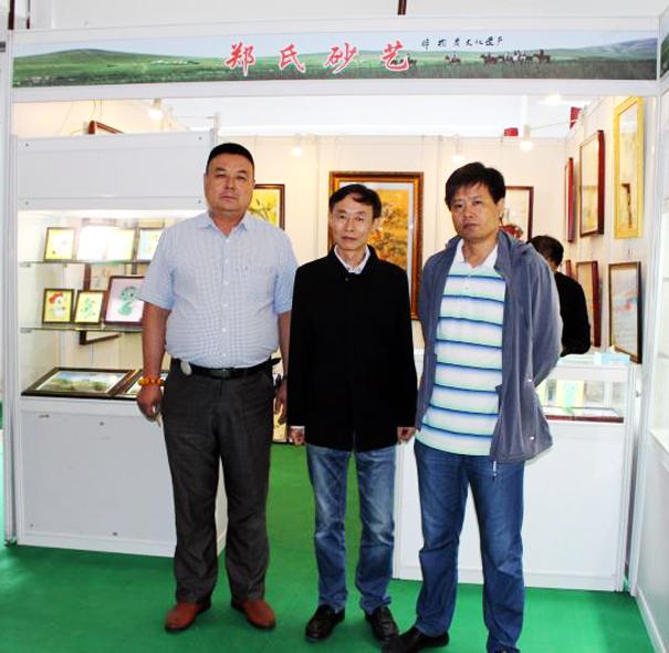 鄭總與河北省文聯(lián)組聯(lián)絡(luò)處處長(zhǎng)張占芳、河北省文聯(lián)機(jī)關(guān)黨委書記常立青在烏蘭察布市首屆京津冀蒙民族民間藝術(shù)博覽會(huì)展位前合影