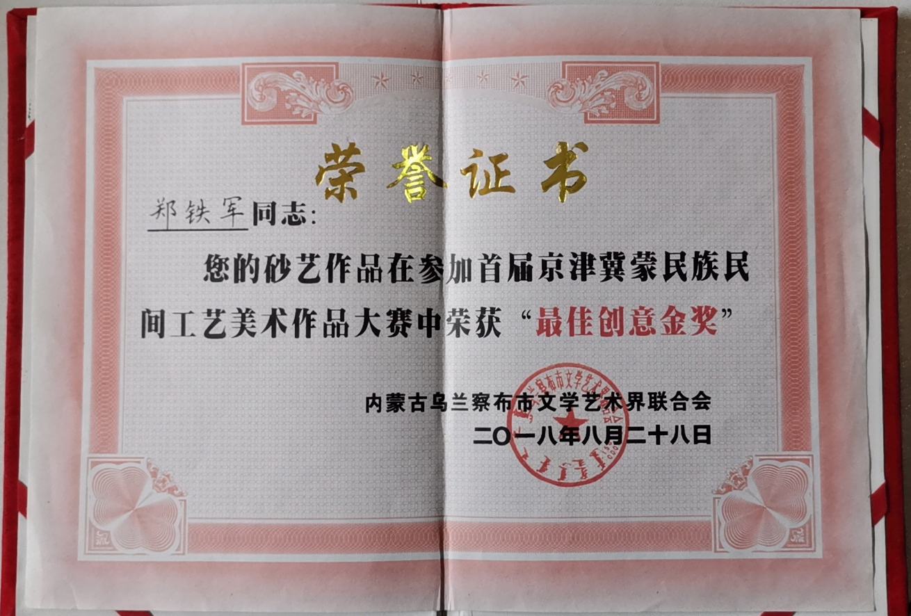 二〇一八年八月十七日至二十一日,烏蘭察布市首屆京津冀蒙民族民間藝術(shù)博覽會(huì)在內(nèi)蒙古自治區(qū)烏蘭察布市開(kāi)幕。興隆縣鄭氏砂藝(畫)以承德市唯一一家省級(jí)非遺民間藝術(shù)產(chǎn)品出席開(kāi)幕式并參展。在活動(dòng)中鄭氏砂畫藝術(shù)品受到社會(huì)各界人士一致好評(píng),并榮獲首屆京津冀蒙民族民間工藝美術(shù)作品大賽“最佳創(chuàng)意金獎(jiǎng)”。