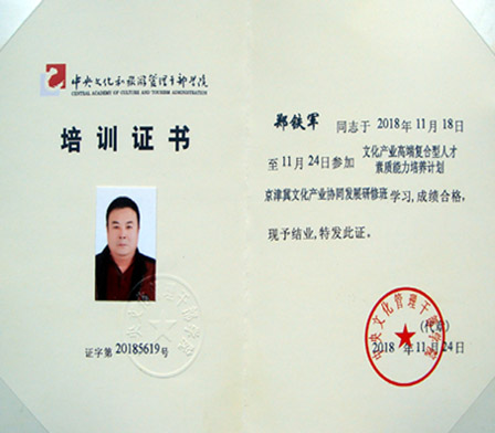 2018年11月18日至24日,興隆縣鄭氏砂藝文化有限公司執(zhí)行董事鄭鐵軍同志,受邀參加中央文化管理干部學(xué)院舉辦的“文化產(chǎn)業(yè)高端復(fù)合型人才素質(zhì)能力培養(yǎng)計劃—京津冀文化產(chǎn)業(yè)協(xié)同發(fā)展研修班”學(xué)習(xí),于11月24日圓滿結(jié)業(yè)。