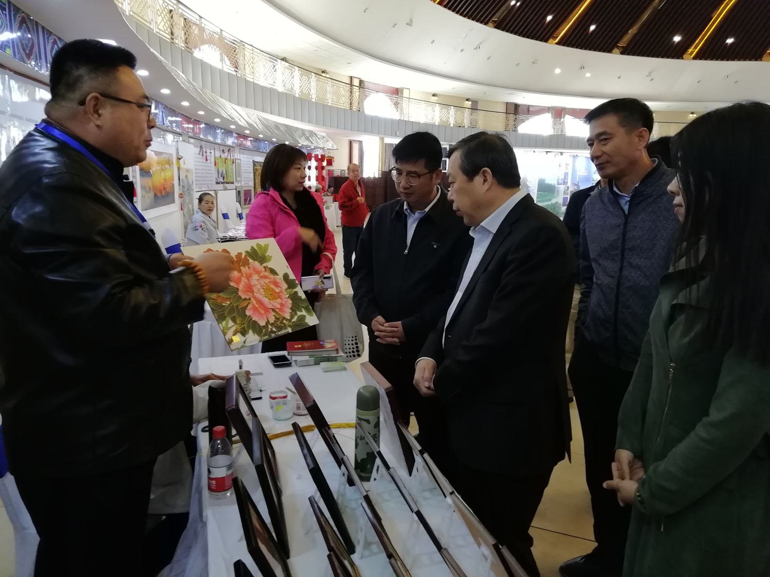 承德市旅游和文化廣電局副局長(zhǎng)王鵬飛、興隆縣旅游和文化廣電局書記閆海濤、興隆縣旅游和文化廣電局局長(zhǎng)張曉莎、興隆縣縣文聯(lián)主席王久霞在董事長(zhǎng)鄭鐵軍的陪同下一起參觀了鄭氏砂畫展品。