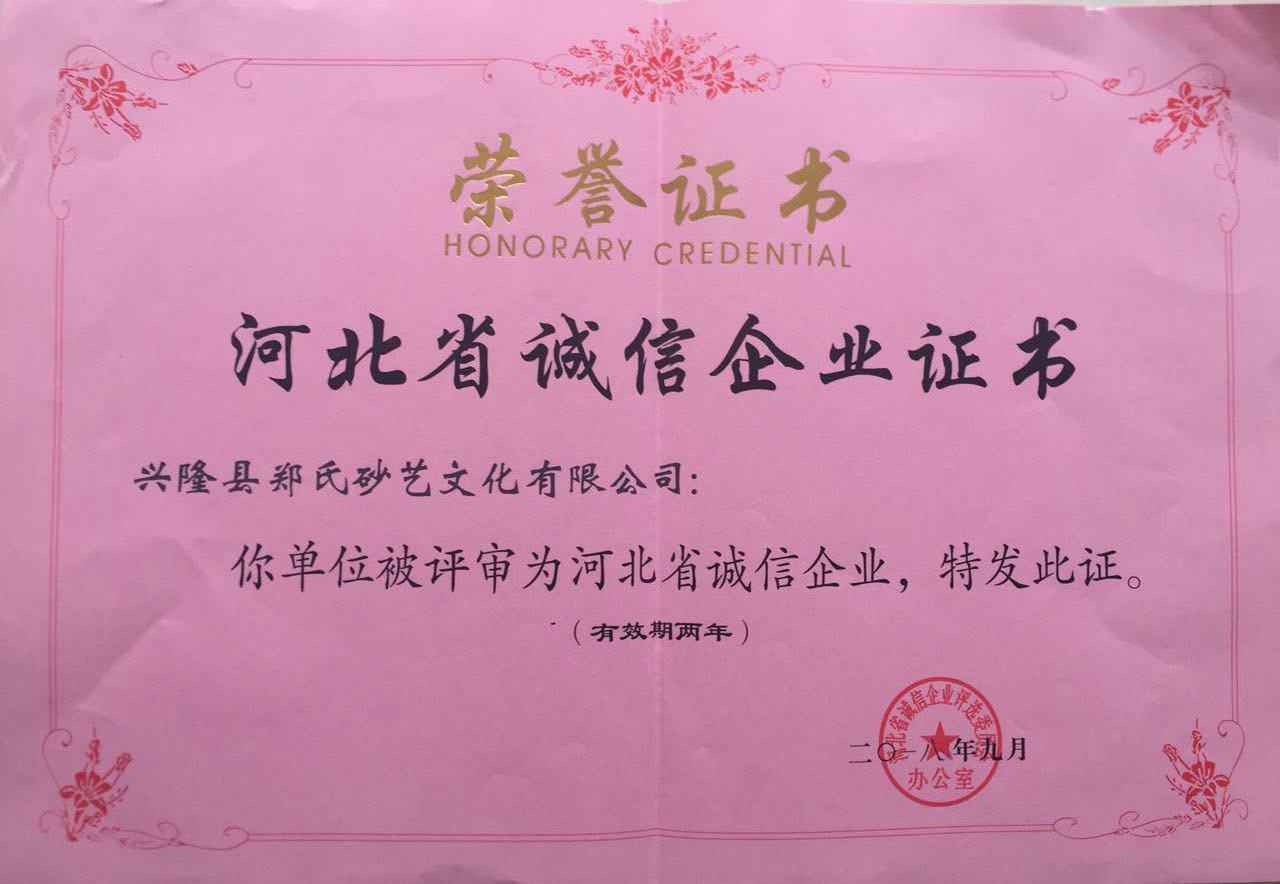 2018年9月27日,興隆縣鄭氏砂藝文化有限公司榮獲了由河北省誠信企業(yè)評選委員會辦公室頒發(fā)的《河北省誠信企業(yè)》稱號,這是繼2014年、2016年后連續(xù)第三次獲此殊榮,為構(gòu)建誠信河北、和諧河北、促進全省經(jīng)濟平穩(wěn)較快發(fā)展發(fā)揮了積極的帶頭作用,為推動我省誠信企業(yè)建設(shè)做出了一定的貢獻。鄭氏砂藝將珍惜榮譽、再接再厲,在創(chuàng)建誠信企業(yè)活動中不斷做出新成績。