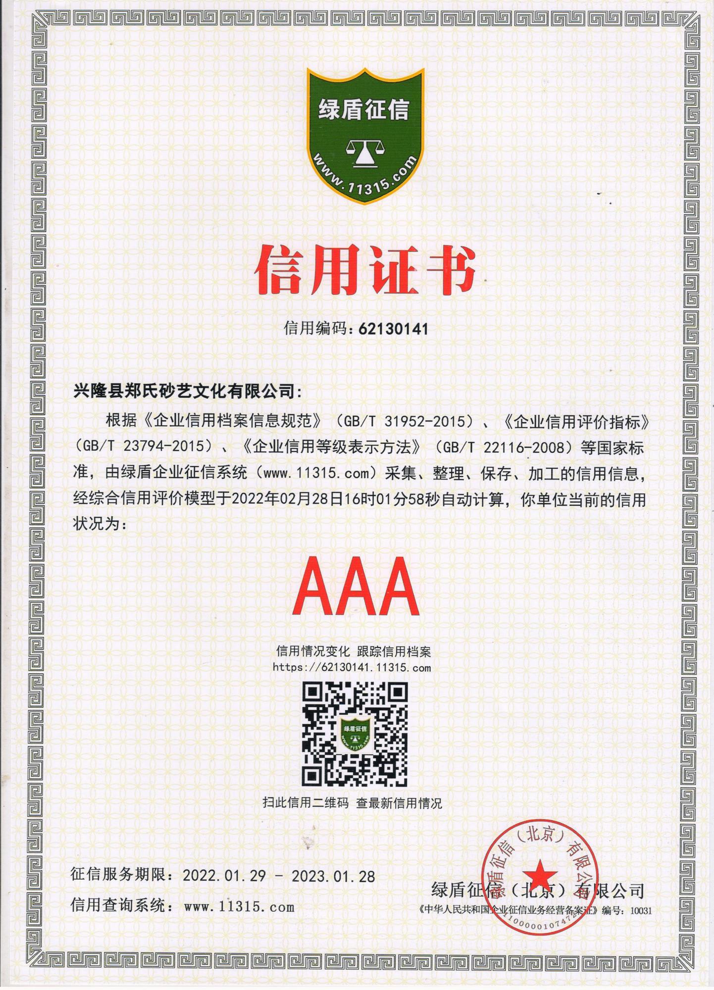 2022年,根據綠盾企業(yè)征信系統(www.11315.com)采集、整理、保存、加工的信息,經綜合信用評價模型自動評估,興隆縣鄭氏砂藝文化有限公司被評為AAA級信用企業(yè),并授予綠盾征信“信用證書”,企業(yè)已連續(xù)五年獲此殊榮。