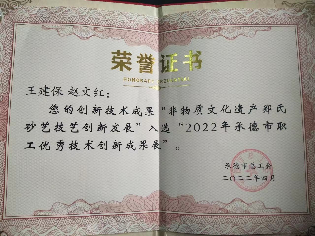 2022年4月26日上午,由承德市總工會組織的“2022年承德市職工優(yōu)秀技術創(chuàng)新成果展”在承德市勞動公園盛大舉行,出席此次活動的主要市領導有承德市市委書記柴寶良、市長王亞軍、市委副書記郭旭濤、市人大常委會黨組書記、主任劉文勤、市政協(xié)黨組書記、主席吳清海、市總工會主席關繼高、市總工會黨組書記常務副主席侯國天、市總工會二級調研員司志通等市總領導。興隆縣出席此次活動的主要領導有縣委副書記孫常君、縣人大常委會黨組副書記、總工會黨組書記、主席王立群、縣總工會常務主席司志允、縣總工會副主席姜存衛(wèi)和部室負責人管宏艷,活動主要展示近年來全市職工群眾性技術創(chuàng)新活動取得的優(yōu)秀技術創(chuàng)新成果。經(jīng)市總初選鄭氏砂藝參加了此次活動,執(zhí)行董事鄭鐵軍攜職工王建保、趙文紅的創(chuàng)新成果“非物質文化遺產(chǎn)鄭氏砂藝技藝創(chuàng)新發(fā)展”入選展示,鄭氏砂藝展示的覆膜砂畫、御用頸枕、水晶砂畫等系列創(chuàng)新作品受到市縣各級領導的一致青睞和好評。