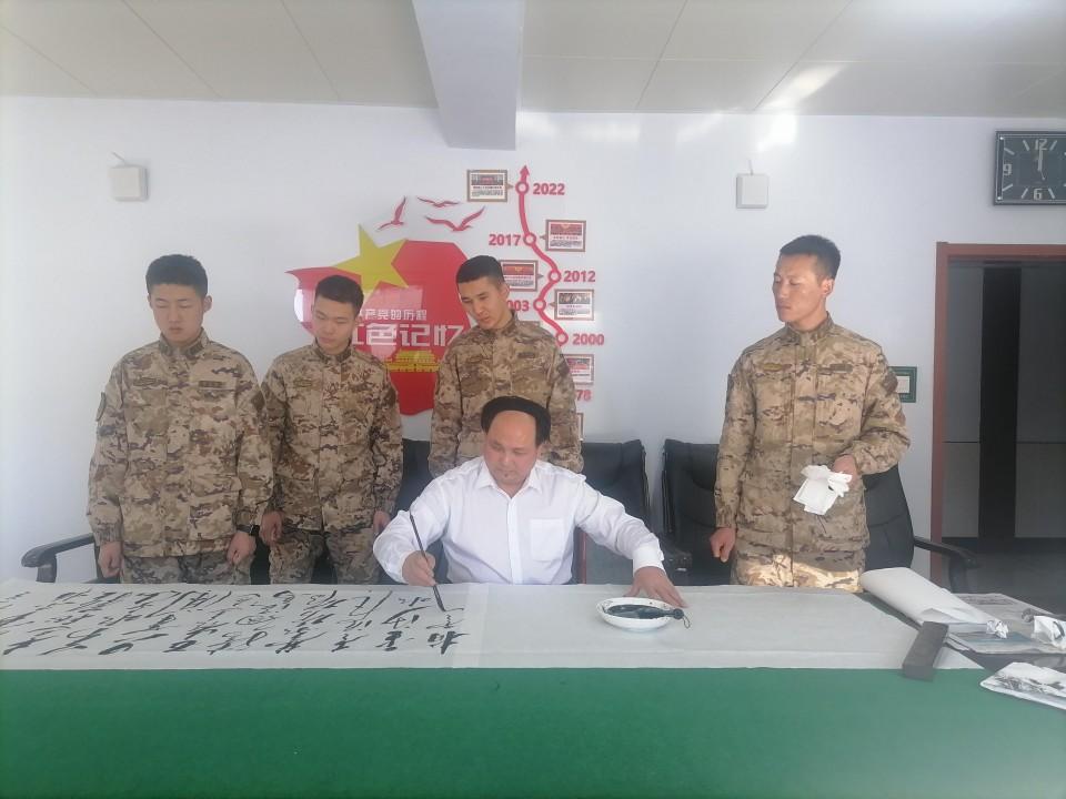 在此次活動(dòng)中,特型扮演者趙士奎老師為承德支隊(duì)官兵題寫了充滿激情的詩(shī)詞《長(zhǎng)征》及“軍魂”等書法作品,展現(xiàn)了其精湛的書法技藝和對(duì)傳統(tǒng)文化的深刻理解,贏得了官兵們的敬意。