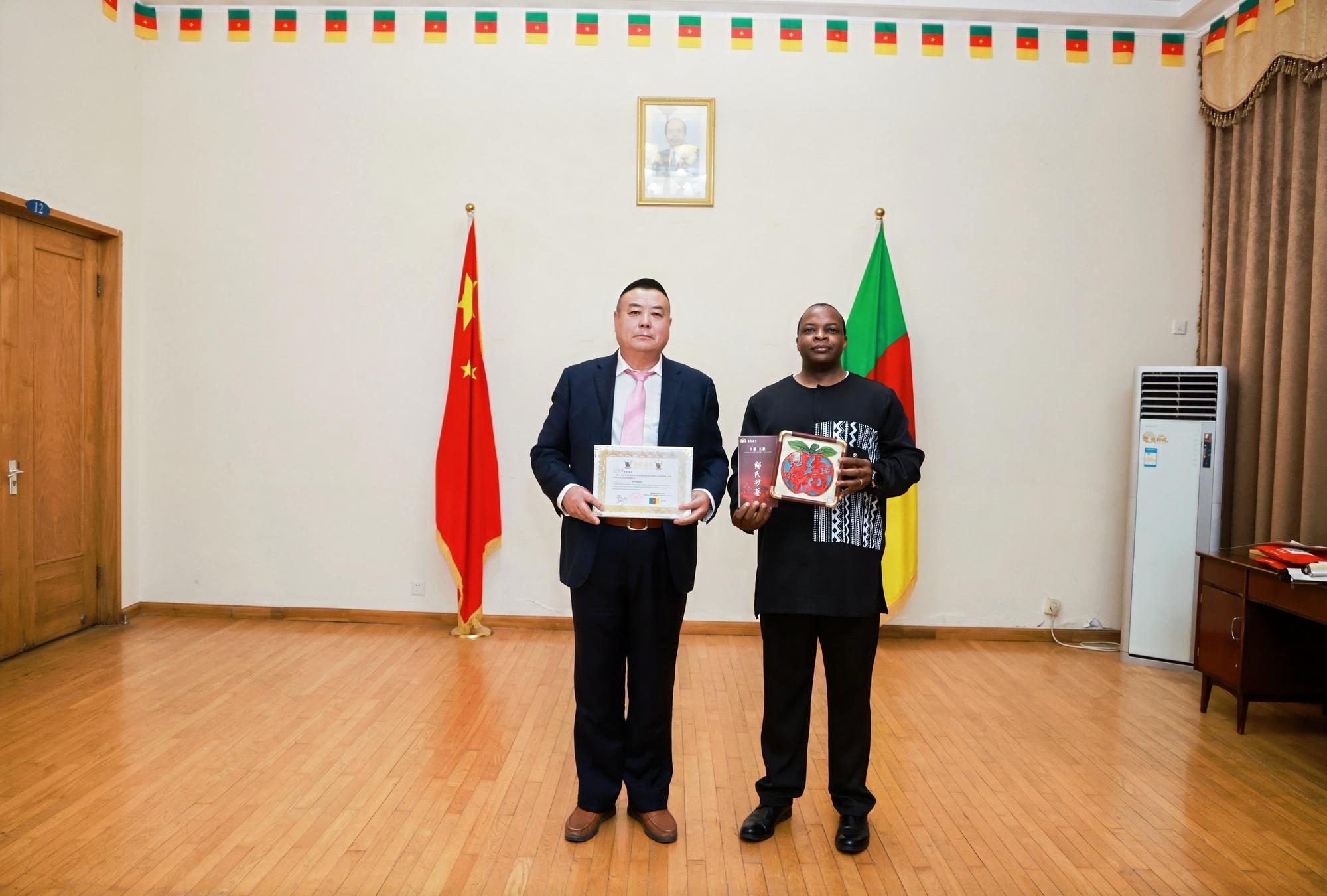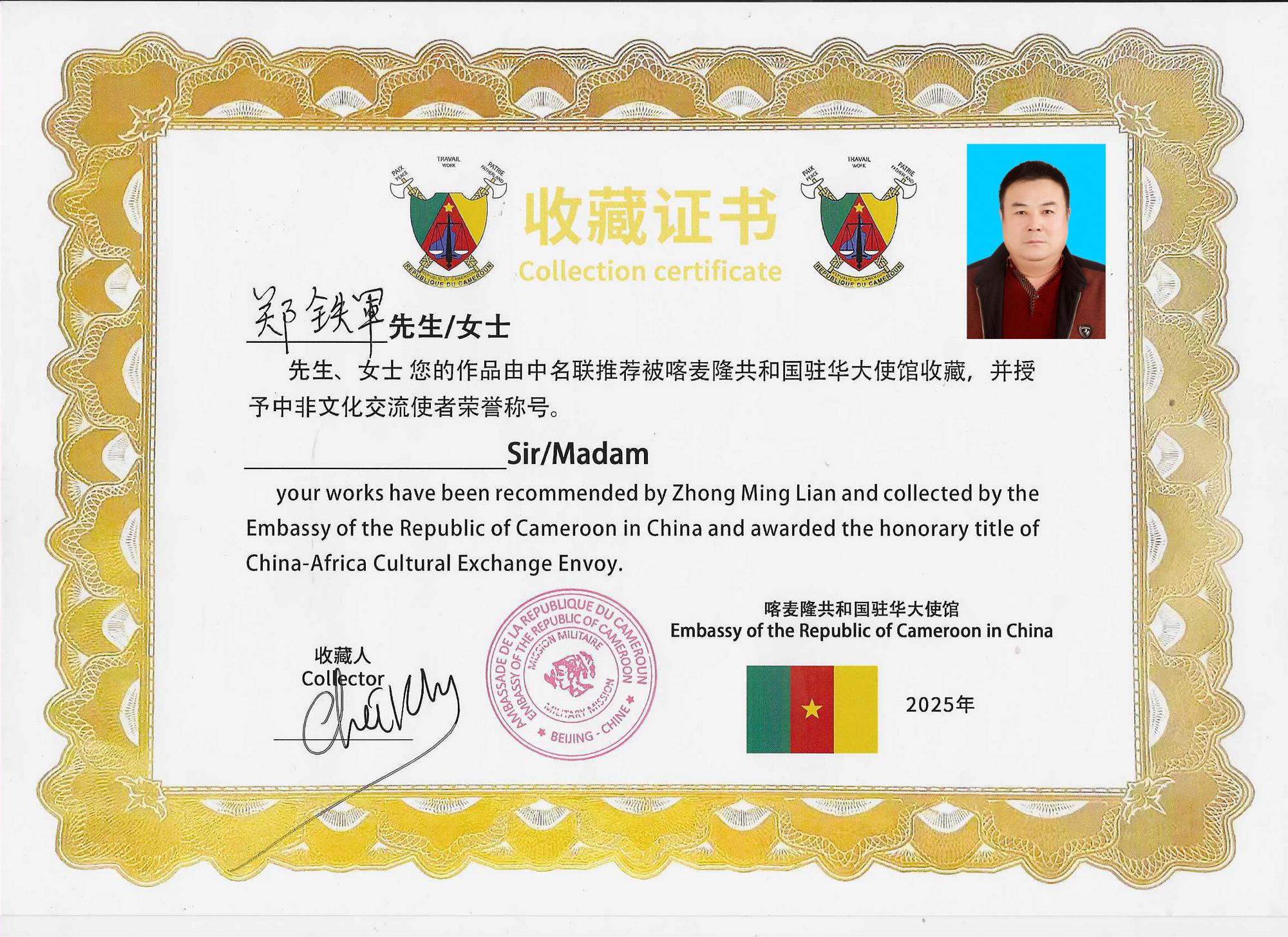 2025年4月26日,中名聯(lián)簽約國(guó)禮藝術(shù)家、非遺傳承人鄭鐵軍應(yīng)邀前往喀麥隆共和國(guó)駐華大使館,參與“一帶一路”中非文化交流活動(dòng)?;顒?dòng)現(xiàn)場(chǎng),其創(chuàng)作的非遺作品《平安福字》被喀麥隆大使館作為國(guó)禮永久收藏,標(biāo)志著河北興隆縣傳統(tǒng)手工藝在國(guó)際舞臺(tái)上的又一次精彩亮相,成為中非文化交流的重要載體??溌●v華使館外交官朱利安·弗雷迪·埃托瓦代表使館,向鄭鐵軍頒發(fā)收藏證書(shū),并授予其“中非文化交流使者”榮譽(yù)稱號(hào) 。