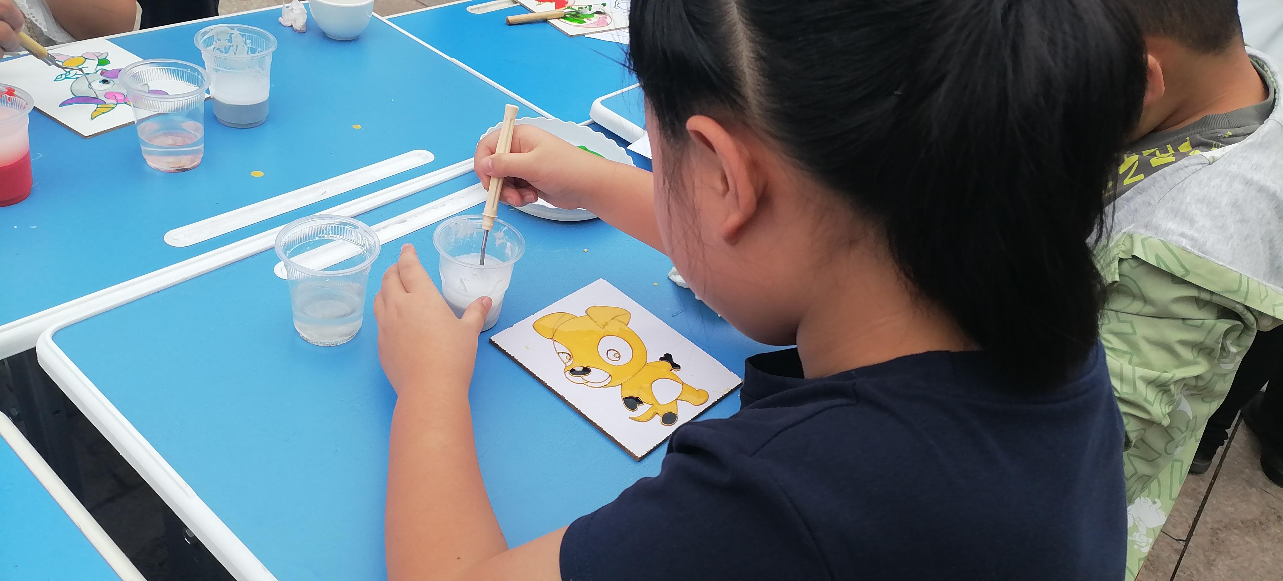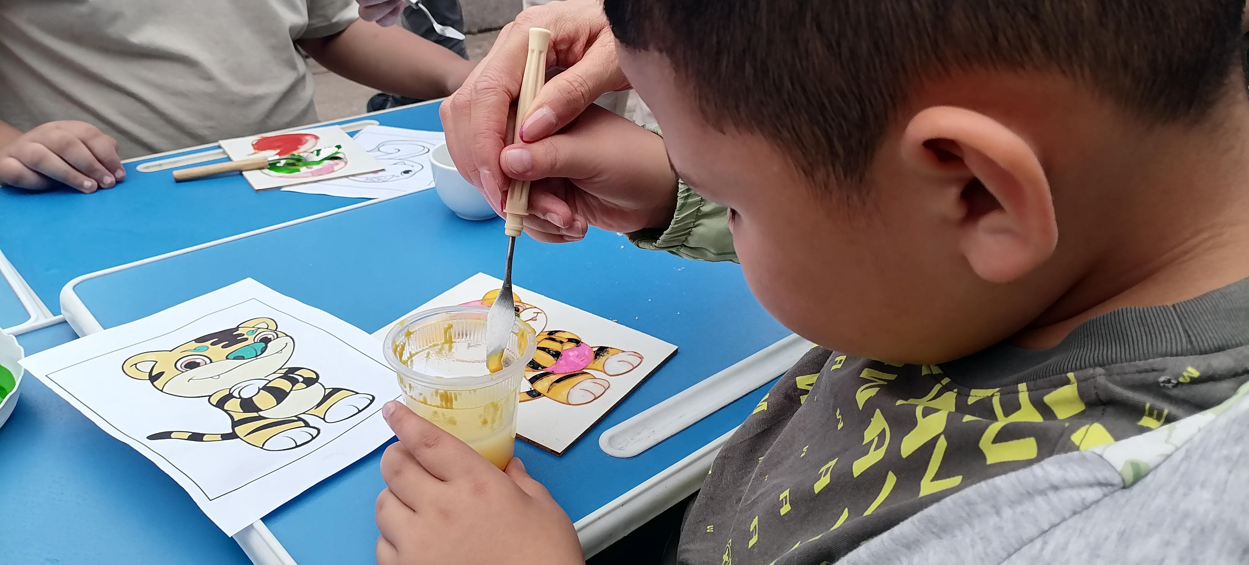 活動(dòng)現(xiàn)場(chǎng),鄭氏砂藝的“天然彩砂+金銀絲”工藝成為孩子們的“興趣焦點(diǎn)”。作為興隆縣的省級(jí)非遺項(xiàng)目,鄭氏砂藝以天然礦物彩砂為原料,采用金絲銀線勾勒?qǐng)D案輪廓,再填充彩砂的傳統(tǒng)手法,既保留了鄉(xiāng)土文化特色,又蘊(yùn)含著非遺技藝的巧思。為讓孩子們輕松參與,技師們特意提前制作了粘好金絲的半成品——一幅幅待填充的砂畫(huà)作品,將“最精彩的創(chuàng)作環(huán)節(jié)”留給孩子。“我要給小虎的臉涂綠色!”“我喜歡藍(lán)色的眼睛!”孩子們圍坐桌前,手持作畫(huà)小鏟,認(rèn)真地將色彩砂石填入金絲框架,同時(shí)互相交流“配色秘訣”,現(xiàn)場(chǎng)充滿了童真與熱鬧。
