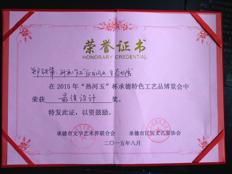 2015年8月,承德市文學藝術界聯合會和承德市民間文藝家協(xié)會舉辦了,2015年“熱河玉”杯承德特色工藝品博覽會,鄭氏砂藝文化有限公司總經理鄭鐵軍的砂畫作品“后龍風水 生態(tài)興隆”榮獲《最佳設計獎》。