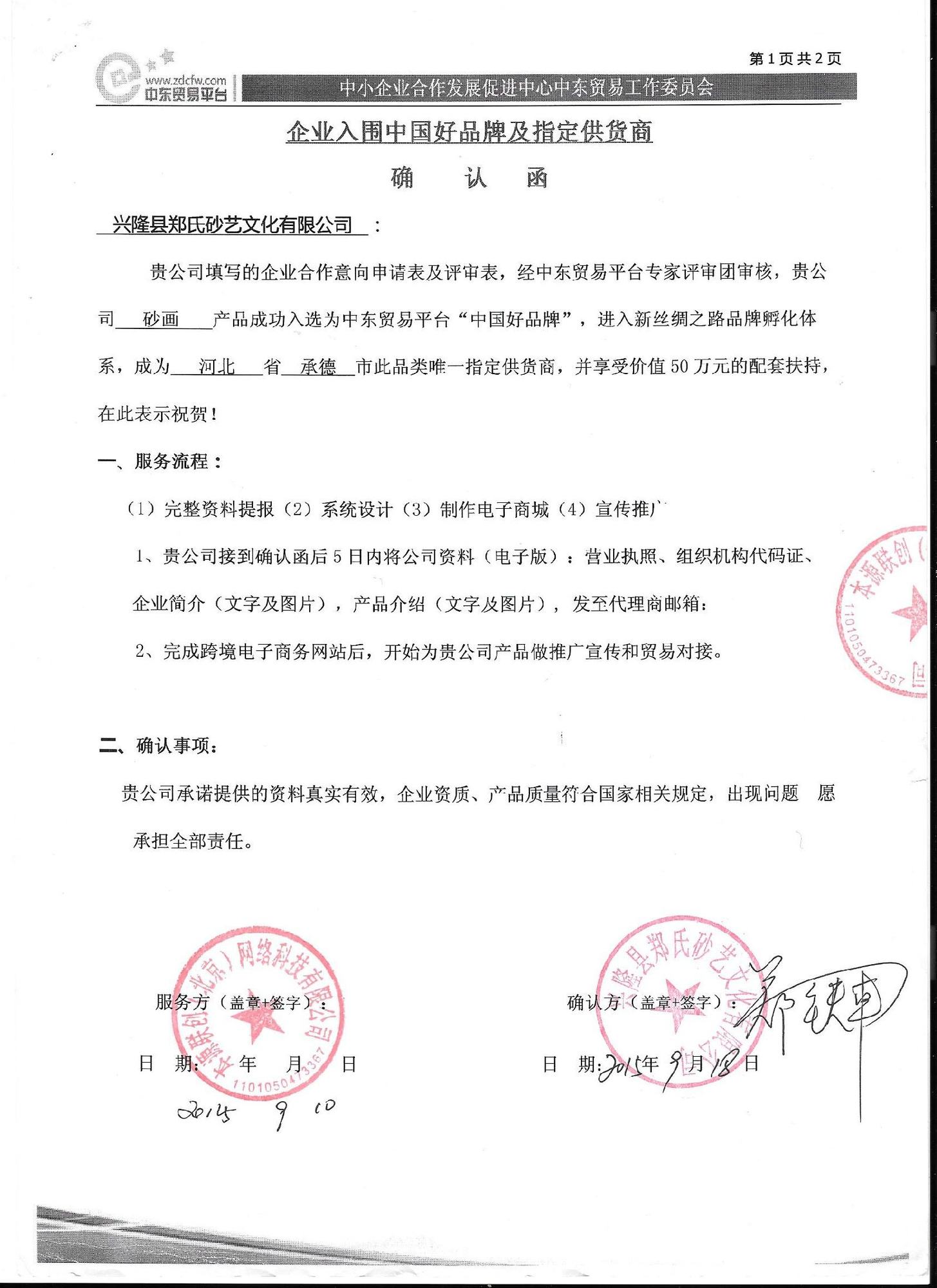 2015年9月10日,經(jīng)中東貿(mào)易平臺(tái)專家評(píng)審團(tuán)審核,本公司的砂畫產(chǎn)品成功入選為中東貿(mào)易平臺(tái)“中國(guó)好品牌”,進(jìn)入新絲綢之路品牌孵化體系,成為河北省承德市此品類唯一指定供貨商,并享受價(jià)值50萬元的配套扶持。
