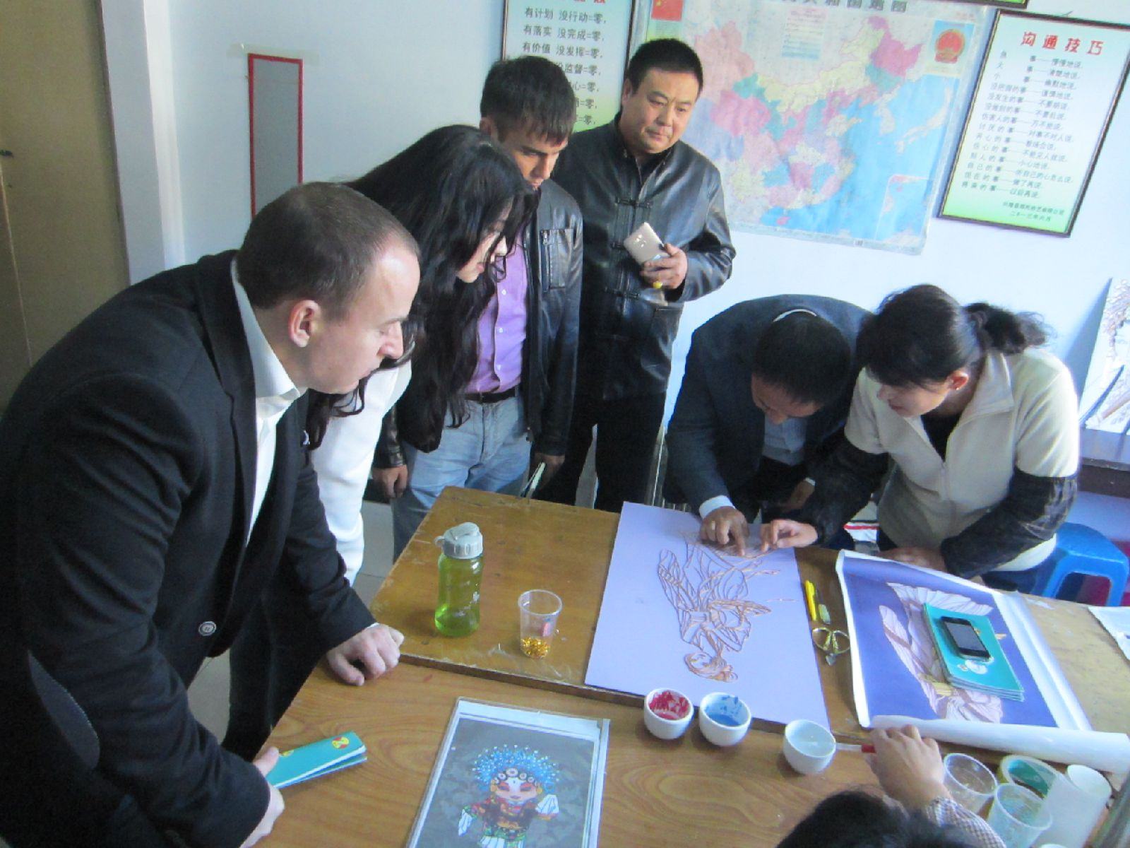 2016年10月17日下午,天津中新天生態(tài)城濱海外國(guó)語(yǔ)大學(xué)董事夢(mèng)祺兼任英語(yǔ)翻譯率領(lǐng)俄羅斯客商勞拉女士(AURA)、鮑家先生(BURTIA)和阿列克謝先生(ALEXANDRIA)來(lái)到興隆縣鄭氏砂藝公司,對(duì)鄭氏金銀絲砂畫(huà)制作車(chē)間、傳統(tǒng)工藝、展廳進(jìn)行了商務(wù)性考察。鄭氏金銀絲砂畫(huà)的傳統(tǒng)工藝、精美的做工和豐富多彩的主題畫(huà)面,引起了客商們的極大興趣和關(guān)注。雙方還就產(chǎn)品交易對(duì)接等工作達(dá)成了初步意向。